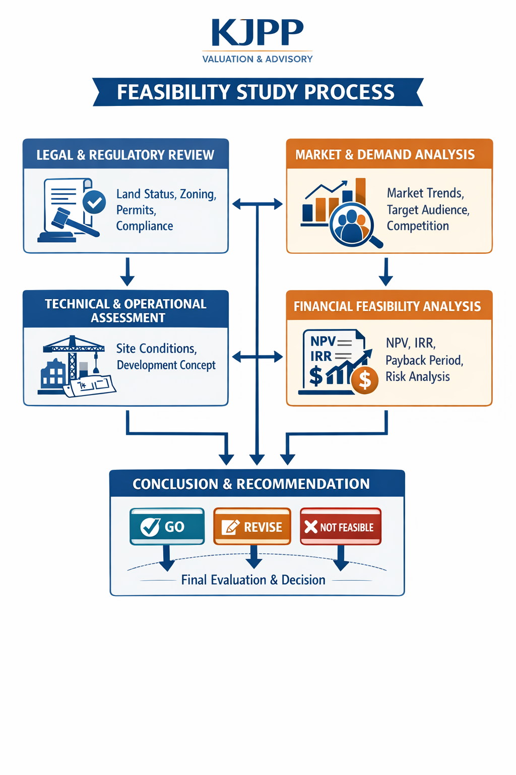 A Feasibility Study conducted by KJPP is a professional, independent assessment to determine whether a business or property development project is viable, sustainable, and worth pursuing from technical, legal, market, and financial perspectives.