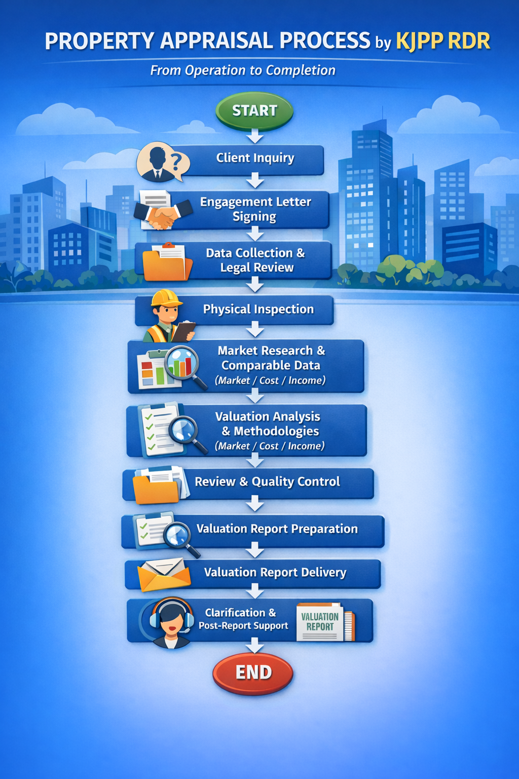 We provide professional property appraisal services delivered with independence and objectivity, in full compliance with Indonesian valuation standards (MAPPI) and applicable regulations. Our services are designed to support confident business, financial, and legal decision-making through credible and well-supported property values.