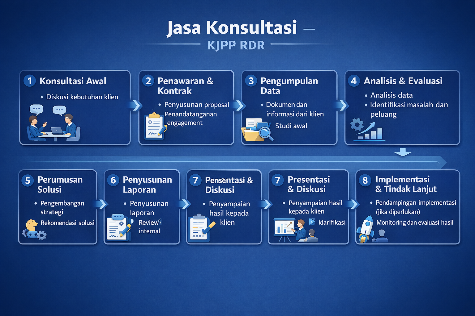 We provide consulting services designed to support every business decision in a measurable and sustainable manner. Through comprehensive, data-driven analysis and an independent, professional approach, KJPP RDR helps identify opportunities, manage risks, and optimize investment potential. Our services, ranging from feasibility studies and market studies to asset optimization and project monitoring, are systematically and informatively organized. With a commitment to quality and integrity, we are a strategic partner, providing tangible added value for the growth and sustainability of your business.